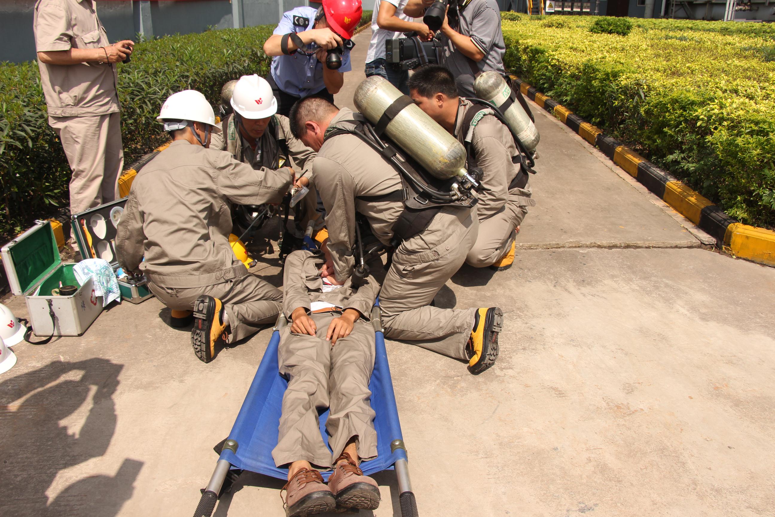 本次演练背景为华体会手机平台两名员工在对煤气设备巡检时,5万吨煤气罐煤气设备发生泄漏事故,一人中毒,同时发生火灾,5万吨煤气罐一旦发生爆炸后果不堪设想,盛隆公司立即将事故情况报告市应急办和市安监局。经过研判,市安委会启动防城港市生产安全事故应急救援预案,迅速成立事故应急指挥部并发布一级应急联动程序,指挥火警119救火堵漏、120紧急救助伤员、气象、环保等部门按照各自职责开展现场监测。经过各小组的密切配合,此次应急救援演练顺利完成。